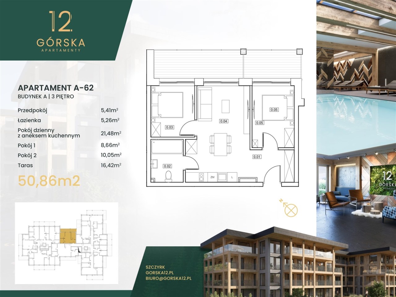 Przedstawiamy apartament A62 o powierzchni 50,52 m2 znajdujący się na 3cim najwyższym piętrze inwestycji składającym się z salonu z aneksem kuchennym, dwóch niezależnych sypialni i łazienki. Salon jest otwarty na aneks kuchenny, dzięki czemu wnętrze jest jasne i przestronne. Lokal posiada panoramiczne okna z ekspozycją południowo-zachodnią. Dzięki czemu zapewnia to dużo światła słonecznego przez cały dzień a z każdego miejsca w mieszkaniu można będzie podziwiać piękne widoki na góry. Do apartamentu przynależy taras do którego można wyjść z salonu oraz każdej sypialni.