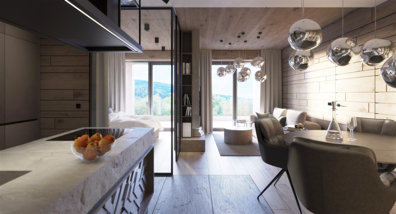 31,44 m2 składający się z salonu z aneksem kuchennym, sypialni i łazienki. Duży przestronny salon jest otwarty na aneks kuchenny, dzięki czemu wnętrze jest jasne i doświetlone. Lokal posiada panoramiczne okna i duży balkon dzięki czemu można będzie podziwiać piękne widoki na góry.