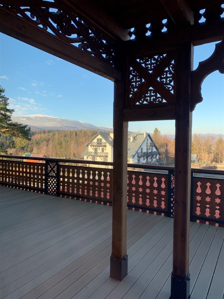 • sypialnia połączona z częścią dzienną oraz wyjściem na widokowy balkon, z którego rozpościera się imponująca panorama Karkonoszy oraz zalewu Sosnówka
